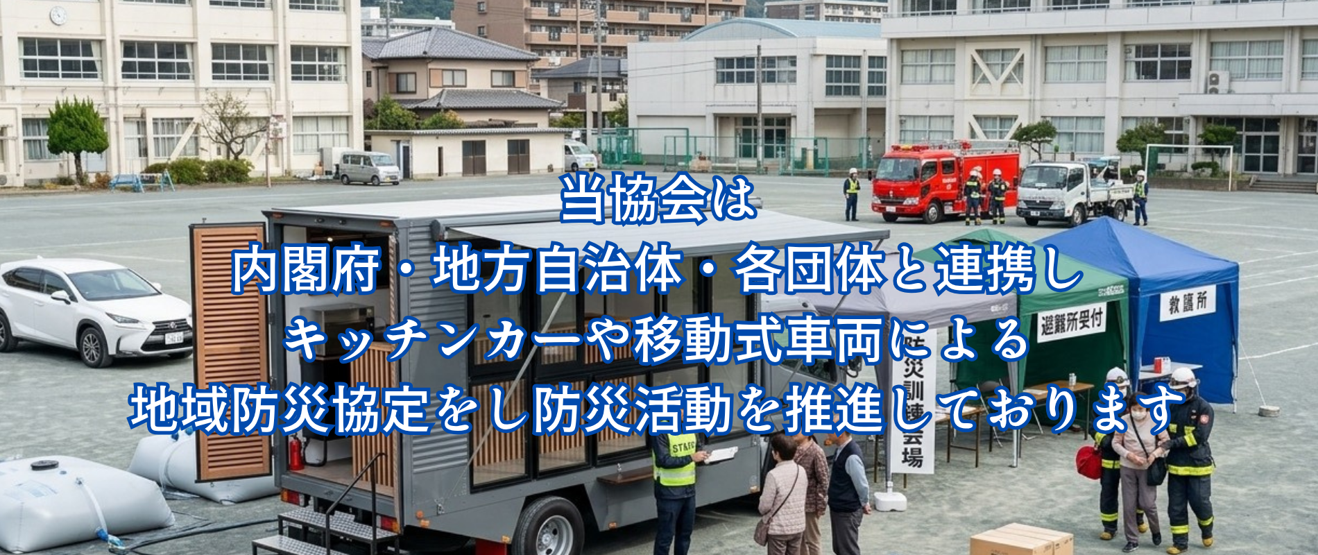 キッチンカーや移動式サロンカーをアイテムにテーマでもある「キッチンカーと防災」を未来へつなぐ活動を行っております。