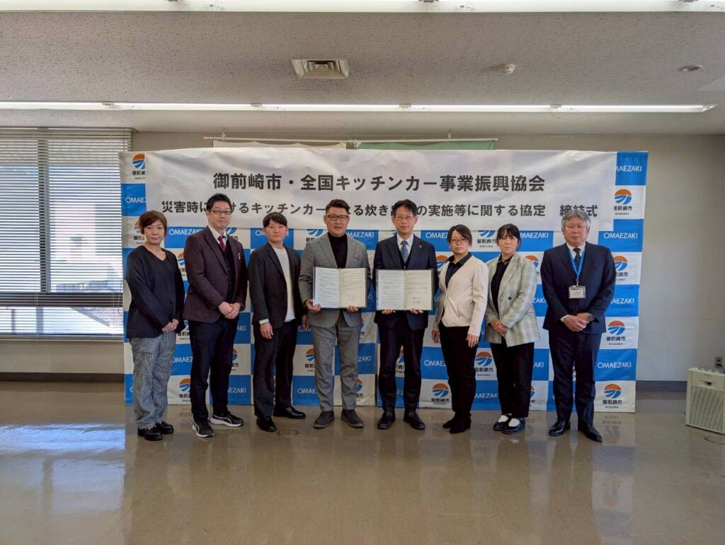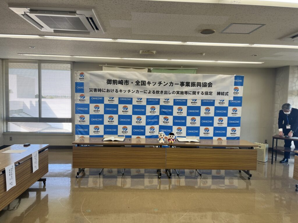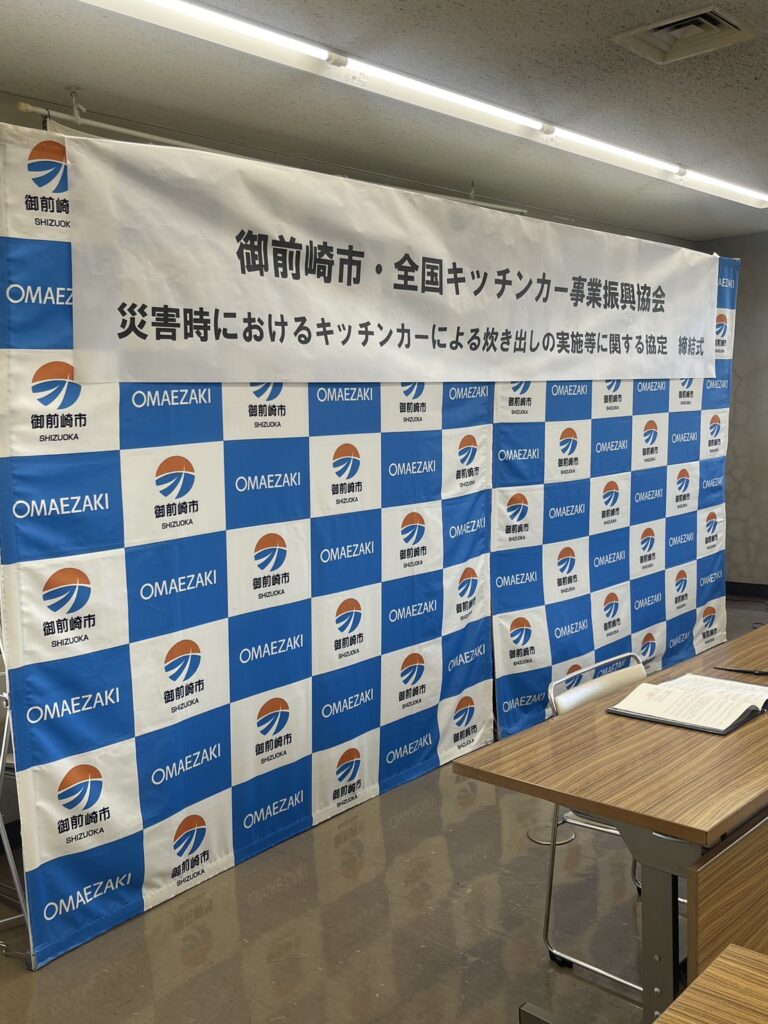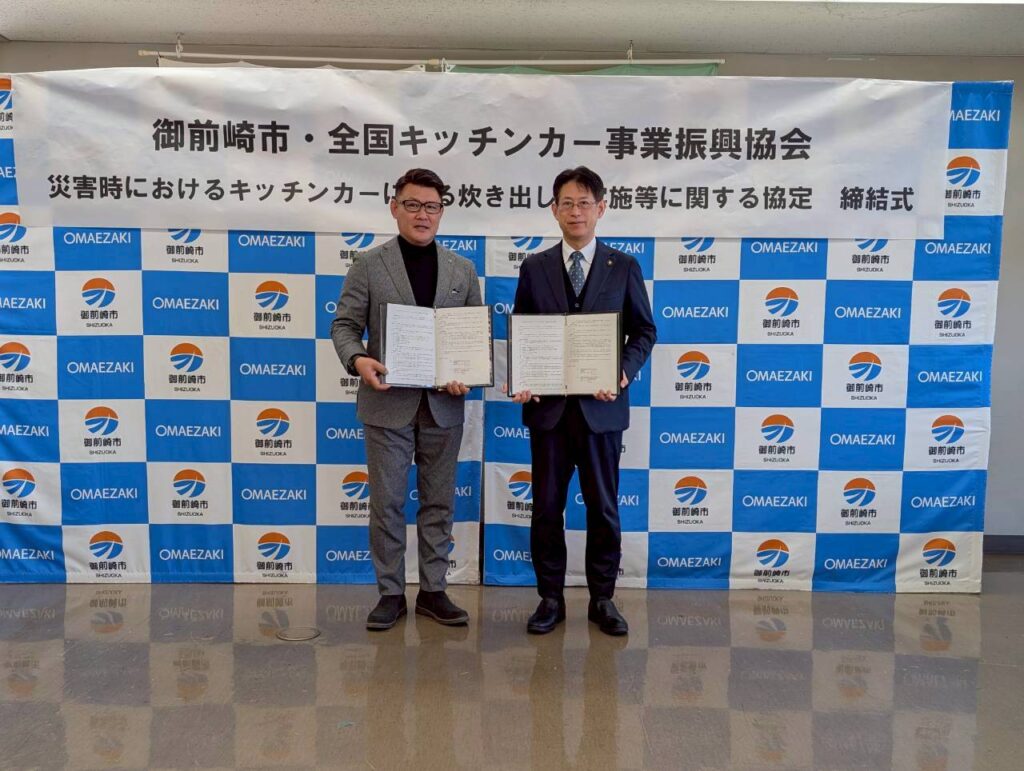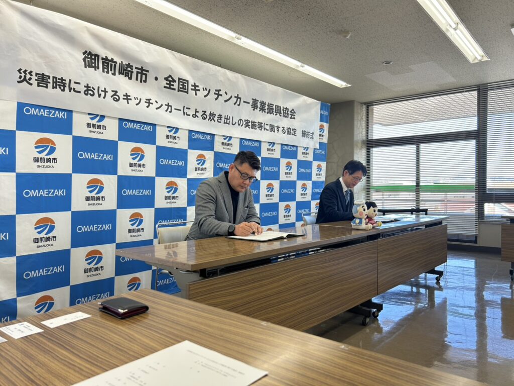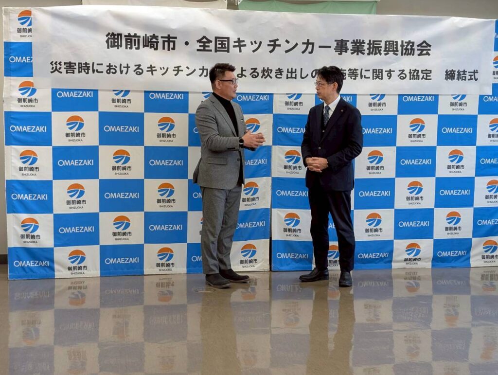 2026年2月23日 / 最終更新日時 : 2026年2月23日 koizumi お知らせ 2026年2月19日 御前崎市とキッチンカー防災協定を締結いたしました 去る2026年2月19日 御前崎市とのキッチンカー防災協定を締結いたしました。 御前崎市の皆様とも協働し地域防災を支えて参ります。また、協定締結式のあと、キッチンカー見学のお時間を設けていただき、職員の皆様にキッチンカーをご覧頂きました。防災はもちろん、地域コミュニティに寄与できるようこれから御前崎市様と連携してまいります。 御前崎市役所のホームページはこちら ≫